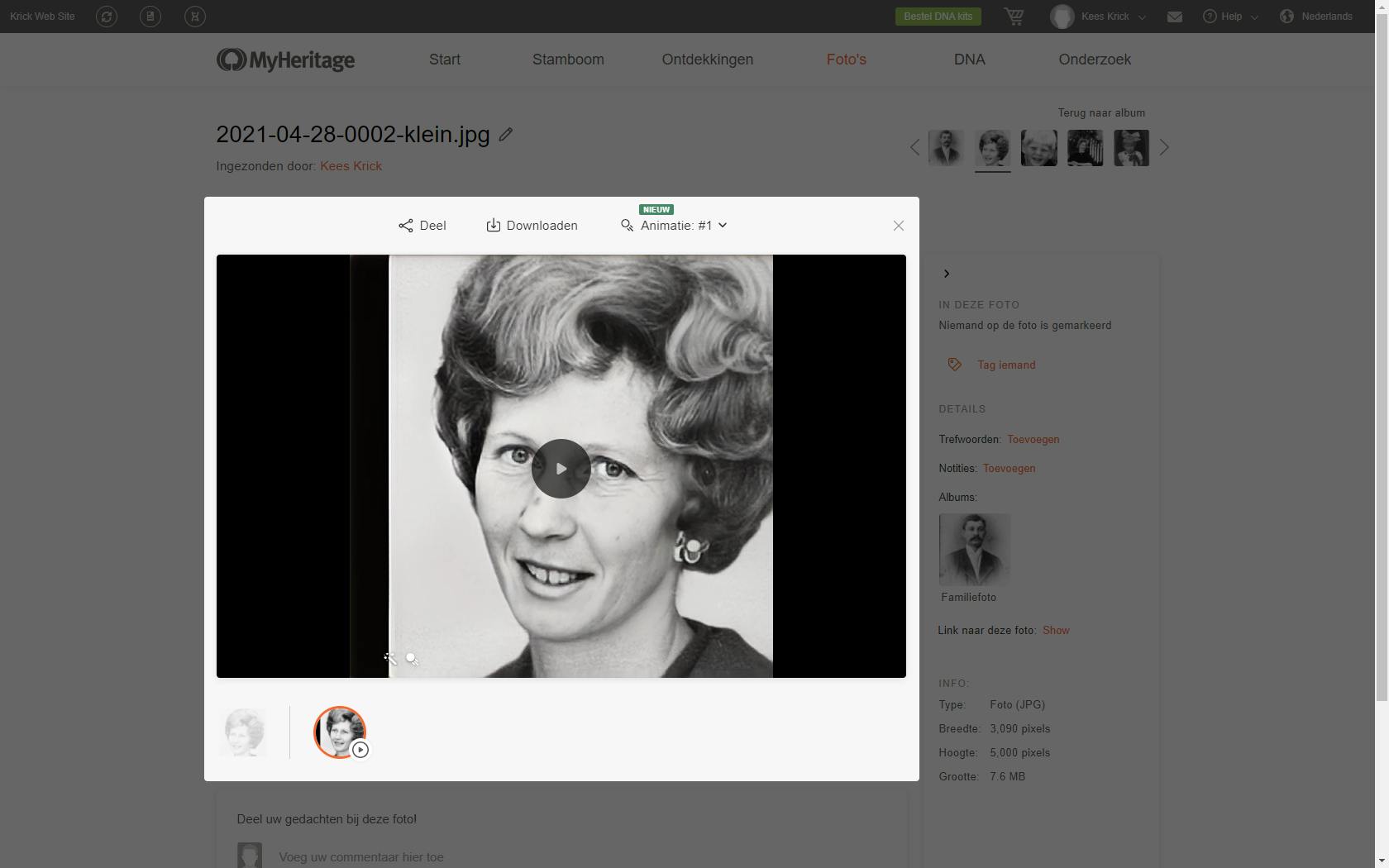 Deep Nostalgia is een onderdeel van het MyHeritage-platform, een website waar je via historische gegevens, familiestambomen en DNA-matchingtechnologieën op ontdekkingsreis gaat in jouw verleden, dat van familieleden en voorouders. Deep Nostalgia mag je gratis uitproberen. Na een aantal animaties is een abonnement nodig om familiefoto’s om te zetten in levendige filmbeelden. Een andere handige fotofunctie is een tool waarmee je zwart-witfoto’s via deep learning-technologieën kunt omzetten in kleurenfoto’s. Sinds kort kunt je hiermee ook vervaagde kleurenfoto’s lekker opfrissen. Ook vervaagde foto’s kunnen worden opgeknapt, waardoor gezichten weer goed scherp worden weergegeven.