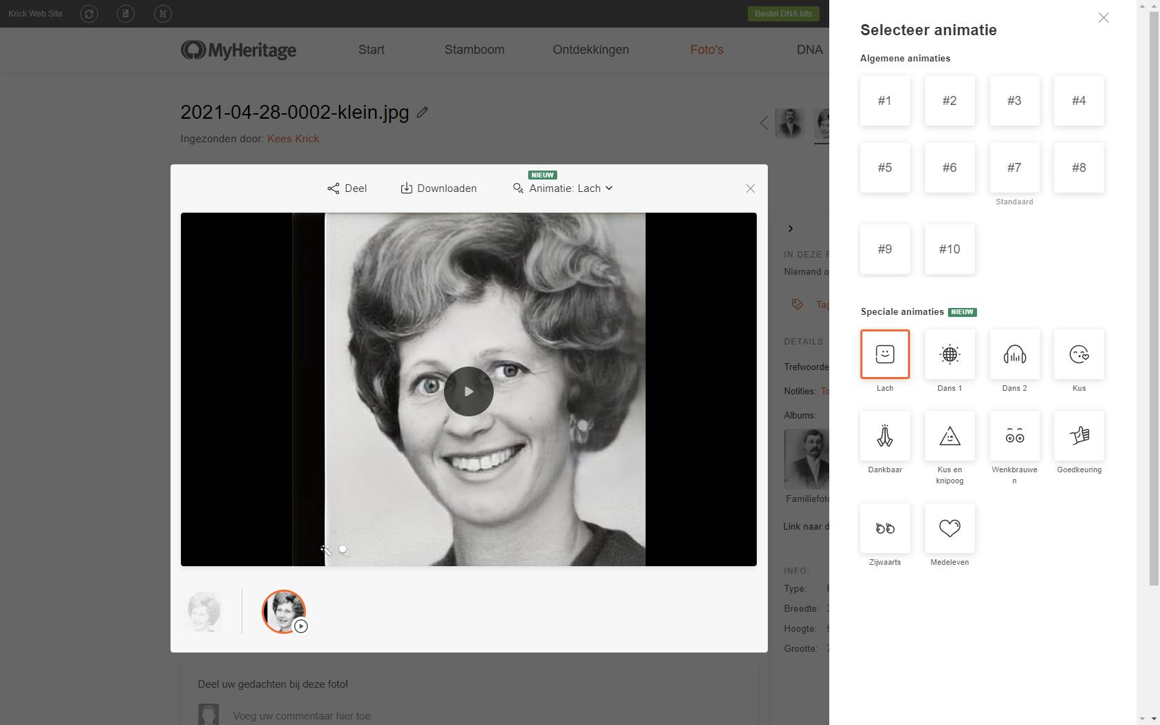 Daarnaast zijn er enkele speciale animaties, zoals lachen, dansen (meer meedeinen op een denkbeeldig deuntje) of een goedkeurende blik. Niet elke animatie werkt bij elke foto even goed, dus ook om die reden is het prettig dat er veel variatie is in animaties. Daarnaast ontdek je zo steeds weer ‘een nieuwe kant’ van een familielid en raak je er niet zo snel op uitgekeken. Elke animatie kun je als een kant-en-klaar filmpje downloaden naar je computer of smartphone, waarna je het zonder speciale AI-software op elk moment kunt afspelen.
