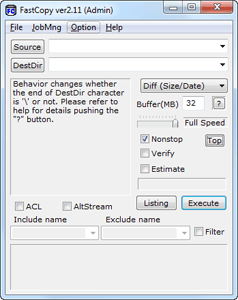 Voordat we het programma bespreken, eerst een klein puntje over de installatie. Wanneer u FastCopy namelijk uitpakt, kunt u het programma openen of op Setup.exe klikken. Dat doet vermoeden dat dit programma dus zowel draagbaar (zonder installatie) als op reguliere wijze kan worden gebruikt. Dat blijkt dus niet waar, zodra u handelingen gaat uitvoeren krijgt u vage foutmeldingen. Pas na het uitvoeren van het installatieprogramma werkt FastCopy naar behoren en dat had duidelijker moeten zijn. Duidelijkheid is een sleutelwoord dat sowieso niet heel erg van toepassing is op dit programma. Zodra u het hebt gestart, krijgt u een compacte interface met opties die niet iedereen iets zullen zeggen.