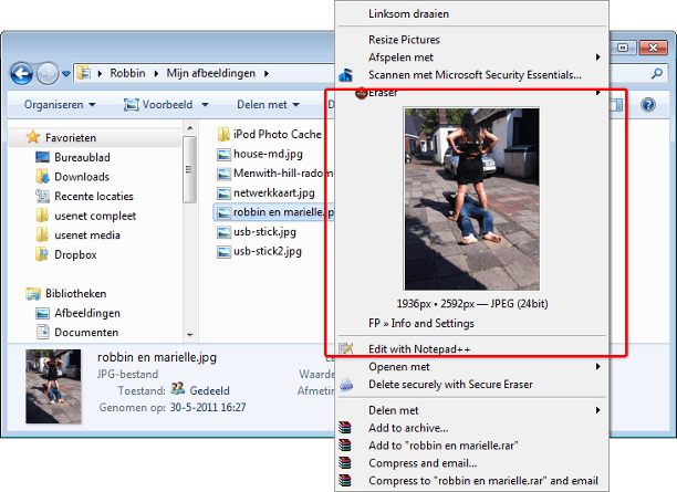 Na een klik met de rechtermuisknop toont FastPreview een voorbeeldweergave van uw afbeelding.