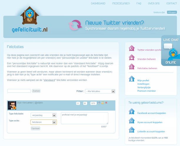 Feliciteren met Gefelicitwit is erg eenvoudig. Na de korte, gratis registratieprocedure moet u zich nog even door de instellingen wurmen. U kunt kiezen of u de suggesties van jarige vrienden wilt ontvanger per E-mail of Direct Message. Het is zelfs mogelijk om iedere maandag een overzicht te krijgen van de jarigen van de komende week. U bepaalt helemaal zelf wat al dan niet automatisch moet gebeuren. Vervolgens moet u enkel nog uw Twitter-account koppelen aan Gefelicitwit. Vrienden die de toepassing ook geïnstalleerd hebt, kunt u nu automatisch feliciteren. Voor uw andere Twitter-vrienden moet u de geboortedatum handmatig invoeren. Hebt u te weinig geboortedatums in uw lijstje? U kunt Gefelicitwit ook koppelen aan uw Facebook-, Hyves-, of LinkedIn-account. Via Felicitaties beheren kunt u uw persoonlijke boodschap invoeren. Handig.