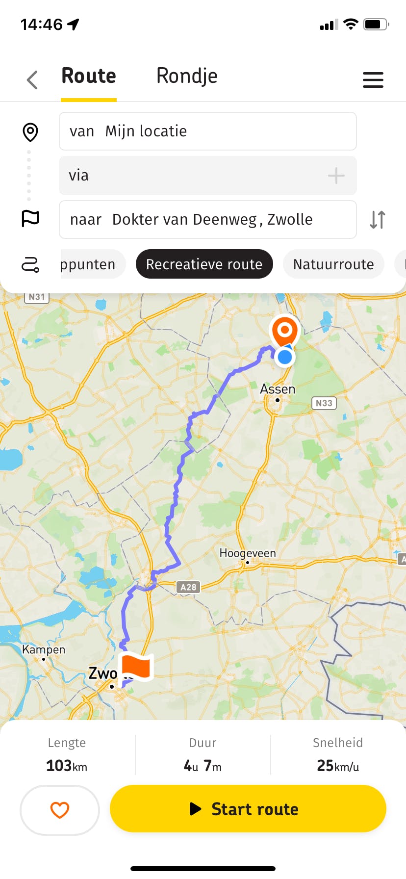 Een route kan van A naar B, eventueel via één of meer tussenstops, of als ronde om gewoon lekker van A naar A te fietsen. Onderweg is er behalve een duidelijke kaart en routeinformatie ook gesproken navigatie. Raak je van de route of is een deel onderweg plots toch geblokkeerd, dan berekent de app een alternatief en brengt je zo weer terug op het juiste pad.