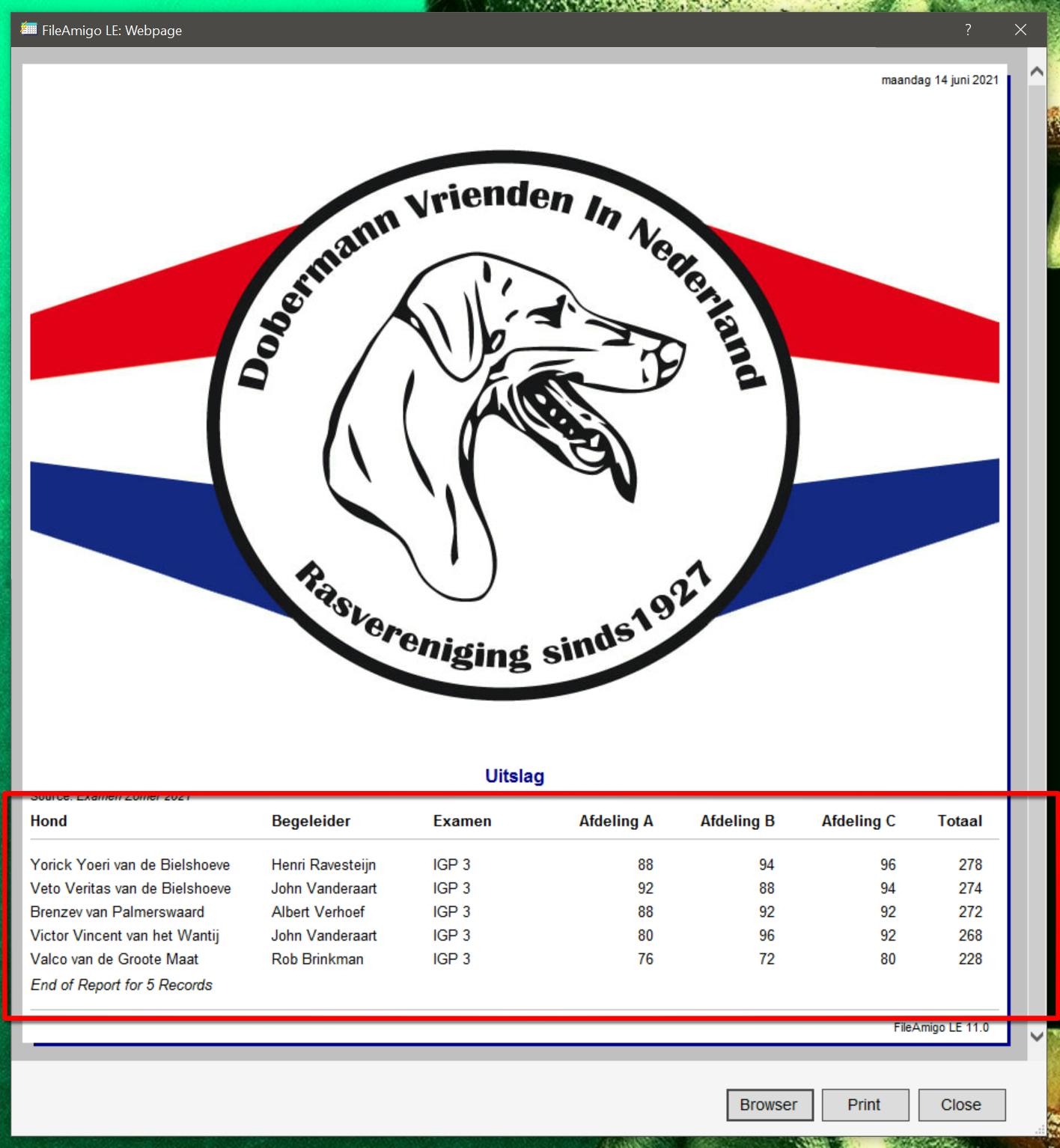 Als alle gegevens zijn ingevoerd, dan wil je die gegevens ook – mooi – kunnen rapporteren. Ga naar File / Manage / File Design en Reports om een nieuwe rapportage toe te voegen aan de kaartenbak. Op het tabblad General geef je de rapportage een naam en ook kun je een logo toevoegen. Het belangrijkste tabblad is natuurlijk het tabblad Columns, want op die plek vertel je welke velden in welke volgorde op de rapportage moeten komen te staan. Daarbij even opgelet, want via de optie Sort kun je een sorteervolgorde instellen; om bijvoorbeeld te kunnen sorteren op een behaald puntentotaal. Het aldus aangemaakte rapport komt in het uitklapmenu Reports van FileAmigo te staan en het presenteren van een rapportage is nog nóóit eenvoudiger geweest.