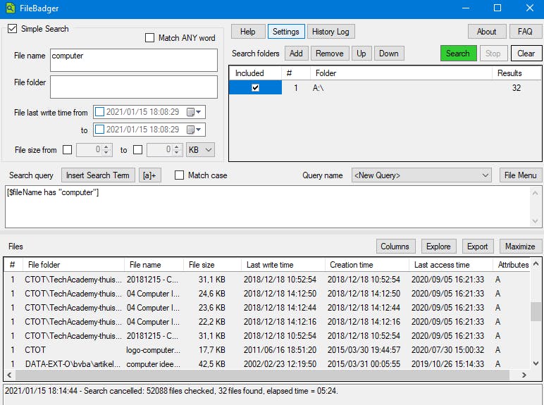 Zo kun je de speurtocht beperken tot bestanden binnen een bepaalde periode en/of met een specifieke grootte. In de resultatenlijst verschijnen naast de naam en de locatie tevens de bestandsgrootte, evenals het creatie-, toegangs- en wijzigingstijdstip. Met een muisklik op een resultaat open je Windows Verkenner op die locatie. De resultaten laten zich tevens naar een csv-bestand exporteren.