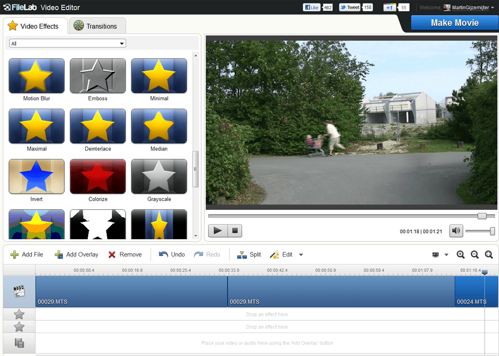 Het programma is een vreemde eend in de bijt. U moet de software downloaden, maar opent deze vervolgens in uw browser. Oftewel, de basisbestanden voor het programma worden op uw harde schijf geïnstalleerd, zodat u de software soepel kunt draaien vanaf de server van FileLab. Videobewerken vanuit de browser, klinkt niet echt aantrekkelijk, maar dat blijkt een onjuiste aanname. Wat is dit programma ongelooflijk goed. Dat begint met de interface, die bestaat uit duidelijke grote knoppen en niet teveel poespas. Een begrijpelijke tijdlijn met lagen (zodat u ook meerdere video's over elkaar kunt leggen) en twee tijdlijnen voor effecten.