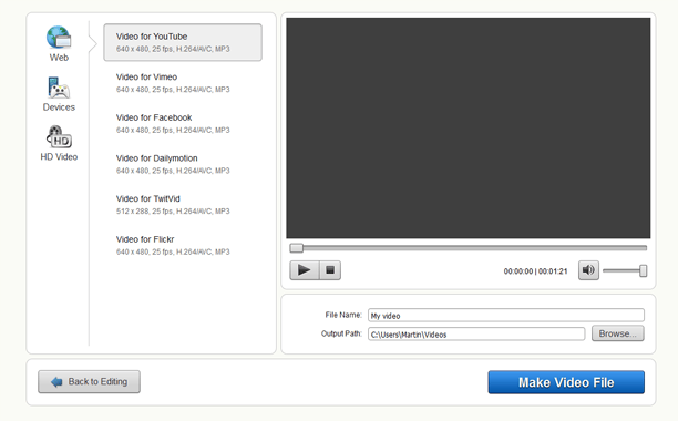 Wel jammer is dat er geen functie is ingebouwd om direct naar YouTube of Facebook te uploaden, vooral omdat u wel kunt inloggen met uw Facebook-account. Maar wat een fijne gratis oplossing is dit voor basale bewerkingstaken. Dikke pluim!
