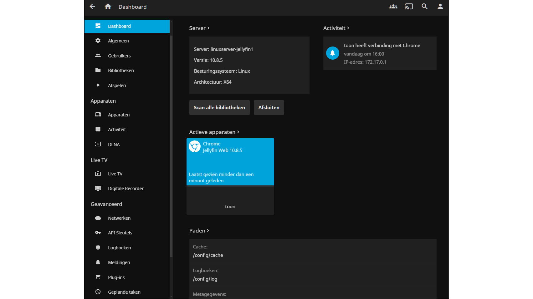 Het Jellyfin-dashboard (geïnstalleerd via Docker op een NAS).