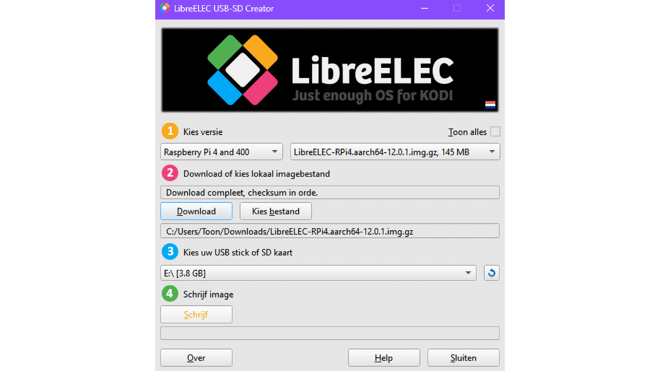 Kodi installeer je eenvoudig op een Raspberry Pi, bij voorkeur model 4 of 5 voor Full HD. Dit gaat het makkelijkst met LibreELEC of OSMC, besturingssystemen die hiervoor zijn ontworpen. We laten kort zien hoe je dit doet met LibreELEC. Download de LibreELEC USB-SD Creator, installeer en start het programma. Selecteer je Raspberry Pi-model bij Kies versie en klik op Download. Kies vervolgens de microSD-kaart voor de installatie en klik op de knop Schrijf om het image op het microSD-kaartje te zetten. Als alternatief kun je ook een tool als Win32 Disk Imager gebruiken om de image naar de kaart over te zetten.