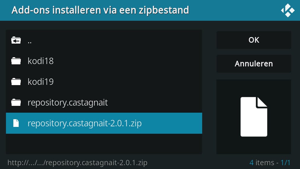 Ga nu naar Instellingen / Add-ons en selecteer Add-ons installeren via een zipbestand. Kies de bron die je zojuist hebt toegevoegd (repository.castagnait) en selecteer het juiste zipbestand (repository.castagnait-2.0.1.zip). Bevestig met OK om de repository toe te voegen.