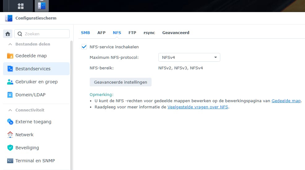 Op een NAS zijn meestal beide protocollen beschikbaar, maar controleer wel of ze zijn ingeschakeld. Op een Synology-NAS open je hiervoor het Configuratiescherm van DSM en ga je naar Bestandsservices. Vink bij SMB de optie SMB-service inschakelen aan. Doe hetzelfde voor NFS via NFS-service inschakelen. Stel daarna de toegangsrechten in voor de gedeelde mappen: klik op Bewerken en open het tabblad Machtigingen (voor SMB) of NFS-machtigingen (voor NFS) om de juiste rechten toe te wijzen.