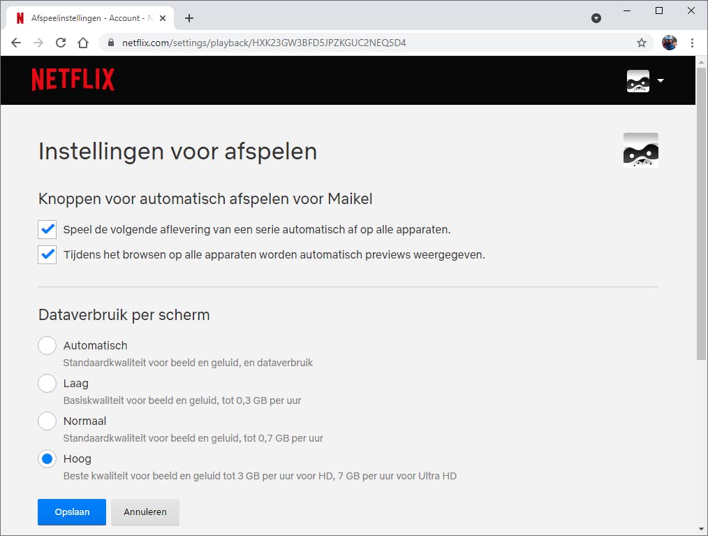 Log in op www.netflix.com/youraccount en klik rechtsboven op je profielafbeelding. Via Account kies je bij Profiel en ouderlijk toezicht het juiste profiel. Klik vervolgens achter Instellingen voor afspelen op Wijzigen. Je selecteert onder Dataverbruik per scherm de optie Hoog, waarna je bevestigt met Opslaan.