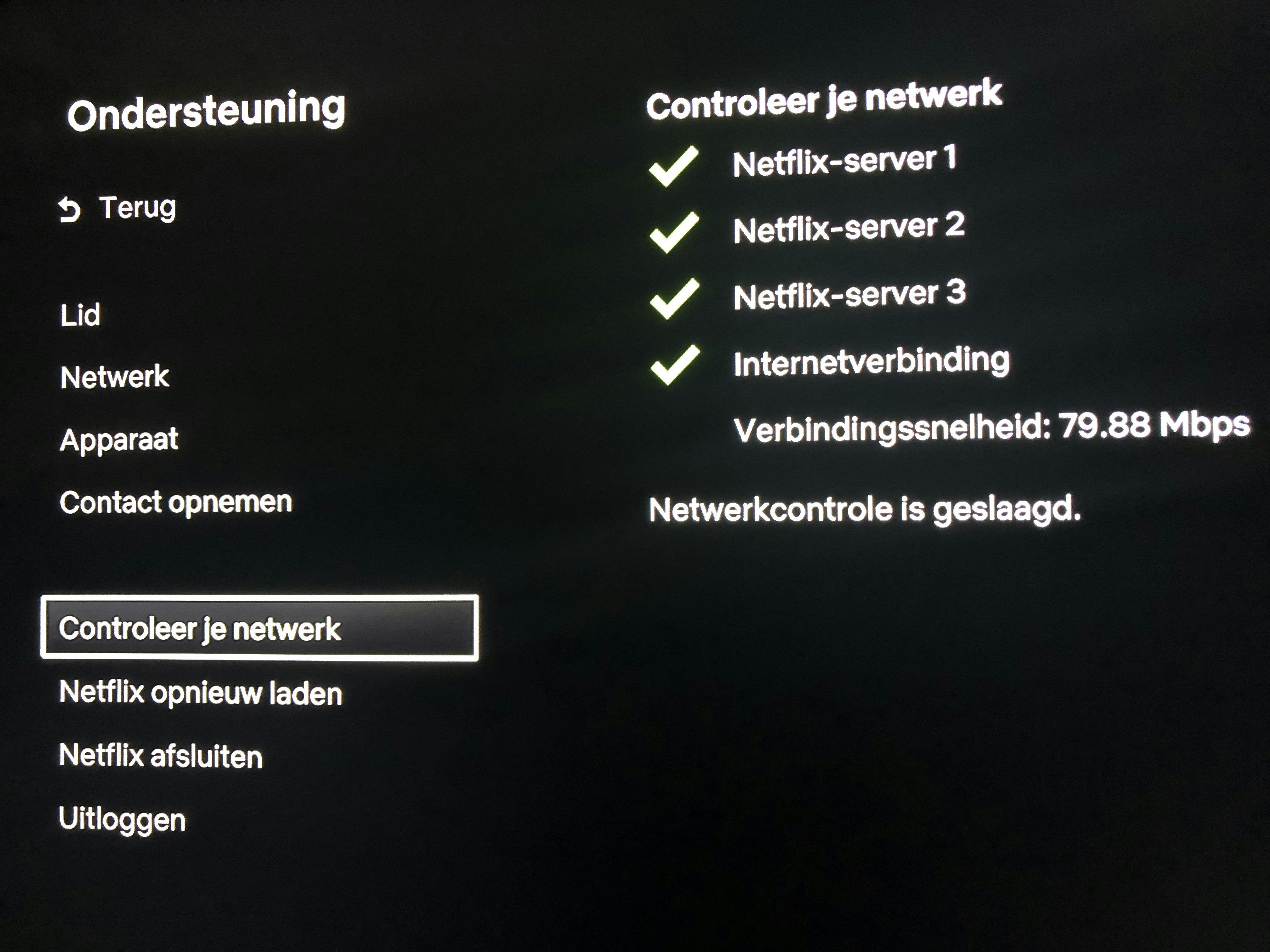 Met de ingebouwde snelheidsmeter van de Netflix-app controleer je op een smart-tv, gameconsole of mediaspeler eenvoudig de huidige internetsnelheid. Ga vanuit het hoofdscherm naar Instellingen of Ondersteuning. Via Controleer je netwerk voert Netflix de test uit. Belangrijk is dat de waarde bij Verbindingssnelheid ruim boven de 25 Mbit/s ligt.
