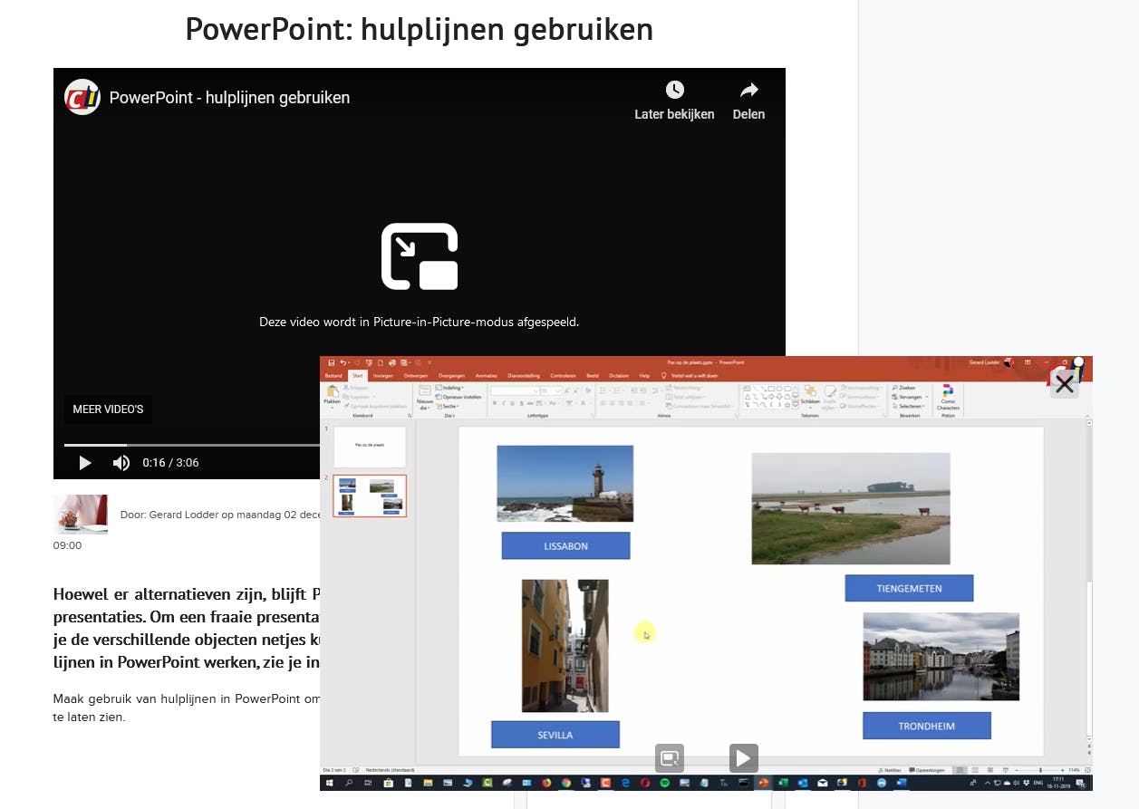 Om picture-in-picture in te schakelen, beweeg je de cursor over een online video. Aan de rechterzijde zie je nu een blauwe knop staan. Klik daarop om de video als het ware uit zijn frame te halen. Deze blijft nu op de voorgrond, ook als je naar een ander tabblad gaat.