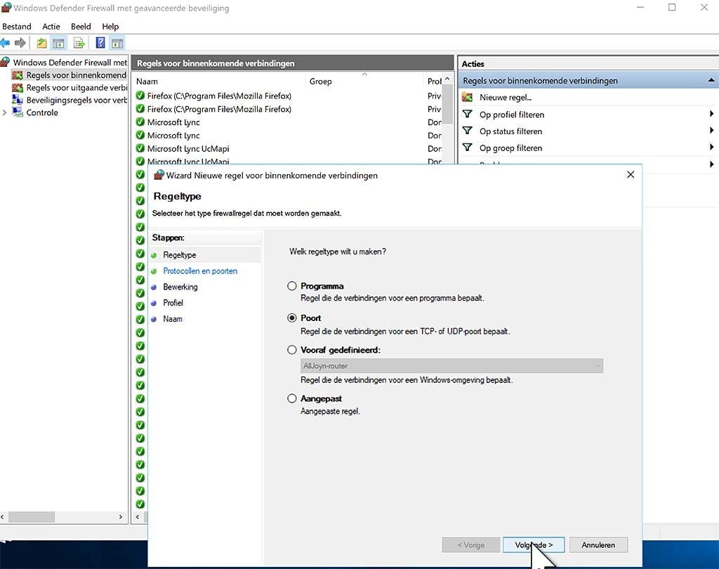 Je kunt software in principe blokkeren door eerst (via het pijltje linksboven) weer terug te gaan naar het vorige venster. Klik dan op Een app toestaan door de firewall. Klik op de knop Instellingen wijzigen en schakel de ongewenste app uit. Het is niet helemaal helder wat er nu gebeurt, in ons geval bleef bijvoorbeeld het als test uitgeschakelde Firefox gewoon internettoegang houden. In dit geval zou Hitman Pro een oorzaak kunnen zijn, mogelijk 'overruled' dit de Windows firewall. Overigens geldt dat in geval van een geïnstalleerde internet security suite de Windows firewall sowieso niet meer gebruikt wordt, dus dan heeft het geen enkele zin om de settings daarvan aan te passen! Hoe dan ook, klik na het uitschakelen van een programma op OK en in principe zou je er vervolgens niet meer het internet mee op moeten kunnen. Veel meer mogelijkheden vind je onder Geavanceerde instellingen. Hier kun je door links op Regels voor binnenkomend verkeer te klikken en dan rechts op Nieuwe regel. Selecteer in de eerste stap van de wizard de optie Poort en doorloop de rest van de vragen. Op die manier kun je je Windowssysteem bijvoorbeeld opzetten als een webserver die over je hele thuisnetwerk bereikbaar is. Wil je dat je systeem ook via internet bereikbaar is, dan zul je in je router port forwarding-instellingen moeten activeren. Let echter extreem goed op met het openen van poorten op je systeem: vaak leidt dit tot grote veiligheidsrisico's. Alleen doen dus als je heel precies weet waar je mee bezig bent!