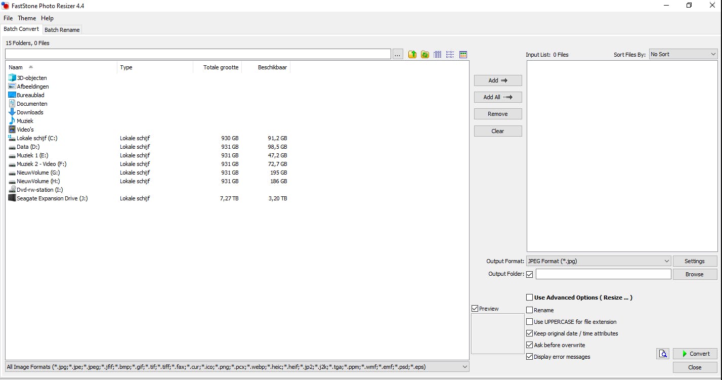 De bestanden die je wilt gaan verwerken kun je links selecteren en naar de Input List rechts sturen met Add, of je kunt ze erheen slepen. Let op: kies je Add All, dan worden ook eventuele onderliggende mappen toegevoegd en dat kan tot ongewenste resultaten leiden wanneer je bewerkte bestanden ook gaat opslaan in een onderliggende map.