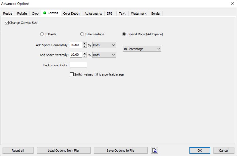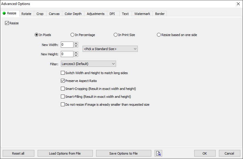 De eerste vier tabbladen van de Advanced Settings hebben allemaal te maken met de afmeting en oriëntatie van je afbeeldingen. Bij Resize pas je de afmeting van het plaatje aan in pixels, als percentage van het origineel of in gewenst afdrukformaat. Je kunt hier afbeeldingen niet alleen kleiner, maar ook groter maken. Bij dit laatste is de kwaliteit overigens niet vergelijkbaar met wat kunstmatige intelligentie op dat gebied presteert. Wij kiezen voor Percentage en 150% in de presets.