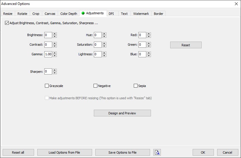 Heb je een verzameling foto’s geselecteerd die allemaal wat donker zijn, dan kun je ze allemaal in één keer met dezelfde hoeveelheid lichter maken op het tabblad Adjustments. Hier pas je helderheid (Brightness), contrast en gammawaarde aan, kun je de kleurtoon (Hue), verzadiging (Saturation) en lichtheid (Lightness) wijzigen en kun je de waarden voor Rood, Groen en Blauw aanpassen (handig wanneer foto’s allemaal dezelfde kleurzweem hebben). Ook kun je hier foto’s verscherpen (Sharpen) en omzetten naar zwart-wit (Grayscale), negatief of sepia.