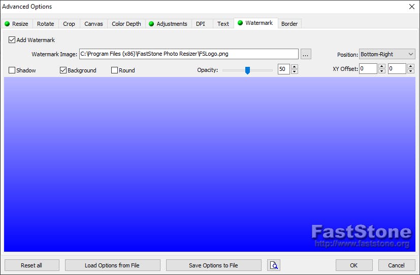 Dat laatste kun je ook doen via het tabblad Watermark. Hier voeg je in plaats van tekst een kleine afbeelding toe, waarbij je weer controle hebt over locatie en transparantie. Wij gebruiken het standaardplaatje.