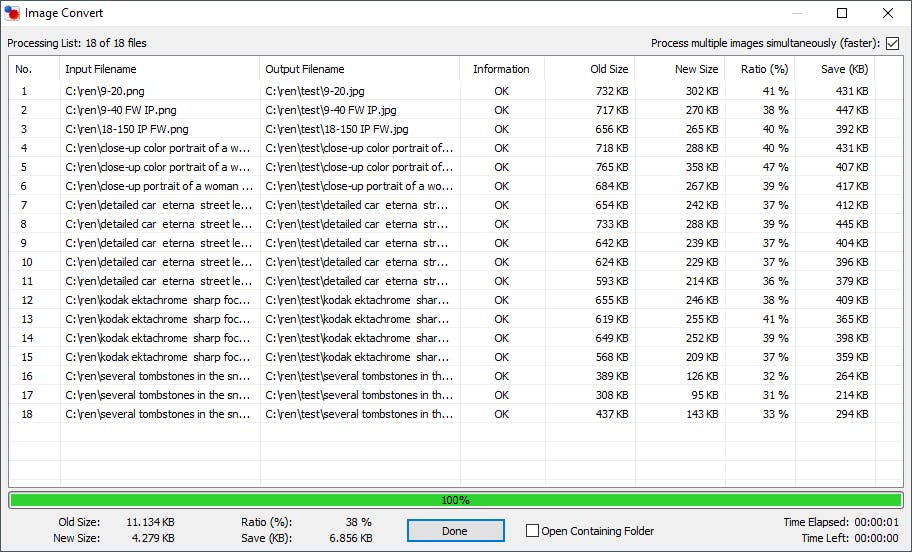 Zoals je ziet, voert FPR alle bewerkingen in razend tempo uit en krijg je een gedetailleerd overzicht van de nieuwe bestandsgroottes. Wil je de resultaten snel bekijken, dan zet je een vinkje bij Open Containing Folder voordat je op Done klikt om dit venster te sluiten.