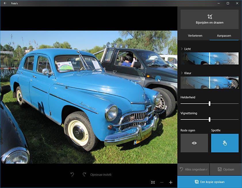 Klik op een foto om deze te openen. Boven de foto zie je een knoppenbalk met diverse mogelijkheden. Klik om te beginnen op Bewerken. In het nieuw geopende paneel vind je onder het kopje Aanpassen diverse praktische gereedschappen. Met de optie Bijsnijden en draaien kan je een 'scheve' foto weer netjes rechttrekken. Of je maakt een uitsnede uit het beeld. Aanpassen van de belichting is eveneens mogelijk met de daarvoor bestemde schuifregelaars. Net als vignettering, een verschijnsel waardoor - vaak bij flink inzoomen - net iets minder sterk belichte hoeken van een foto ontstaan. Met de schuifregelaar onder deze optie corrigeer je dat. De knop Spotfix is ook aardig. Hiermee werk je vlekken weg op bijvoorbeeld een oude gescande foto. Kwestie van op de vlek of beschadiging klikken en - met een beetje geluk - zie je er niets meer van. De knop Rode ogen werkt op dezelfde manier, maar dan voor ogen. Heb je eenmaal van alles gewijzigd dan klik het best op de knop Een kopie opslaan. Daarmee overschrijf je de originele foto niet zodat je er altijd nog op terug kunt vallen.
