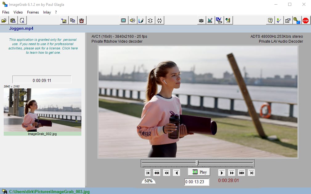 Het programma ImageGrab is gratis voor niet-commercieel gebruik. Je kunt ImageGrab ook als portable versie vanaf een usb-stick laten werken, maar dan moet je die optie aanvinken in de instellingen (te bereiken via F10 of door op de derde knop van rechtsboven te klikken). Het principe van ImageGrab is eenvoudig. Je opent met de eerste knop een videobestand, navigeert met de afspeelknoppen naar het juiste beeld en dan klik je op de vierde knop van linksboven, Grab a picture, of je drukt op F5.