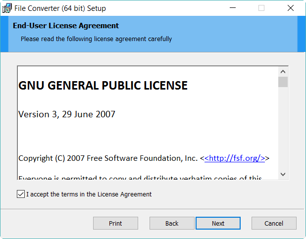 Een goed programma voor deze taak is File Converter. File Converter is een opensourceprogramma dat gebruikmaakt van bekende bibliotheken om video, audio en afbeeldingen om te zetten. Het programma heeft ondersteuning voor m4a, mkv, mp3, wav, webm, wma, wmv, aac, gif, png, jpg, ico, bmp en dvd’s. Het aantal bestandsformaten groeit continu met elke nieuwe versie. Je downloadt File Converter vanaf de website. Klik op de knop Download. Na korte tijd wordt er een .msi-bestand binnengehaald. Voer het gedownloade bestand uit en klik een aantal keer op Next, ga akkoord met de licentievoorwaarden en klik op Install om de installatie te starten. Tijdens de installatie vraagt Gebruikersaccountbeheer van Windows twee keer om toestemming. Klik op Finish om de installatie af te sluiten.