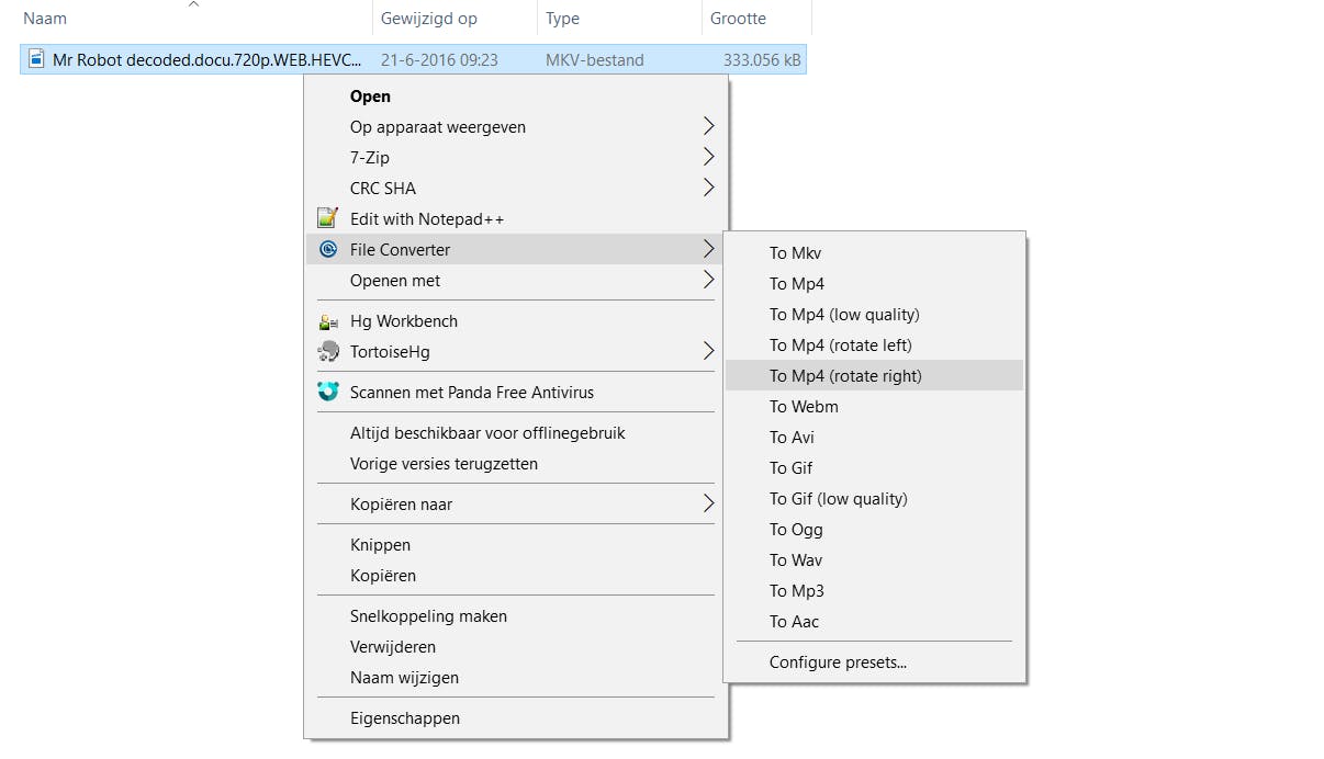 File Converter werkt enkel in de Windows Verkenner. Om een bestand om te zetten, blader je naar de betreffende map in de Verkenner. Klik met de rechtermuisknop op het bestand en kies voor File Converter. Vervolgens opent een lijst met bestandsformaten waarnaar het betreffende bestand omgezet kan worden. Handig is ook de optie om een video te converteren en tegelijkertijd meteen het beeld te roteren. Om een video bijvoorbeeld naar links te draaien, kies je voor de optie To Mp4 (rotate left) in het contextmenu. Om deze lijst aan te passen, klik je op Configure presets. Vervolgens kun je links uit de lijst een uitvoerformaat kiezen en kun je rechts ernaast uit de lijst kiezen welke formaten voor dat uitvoerformaat als invoer kunnen dienen.