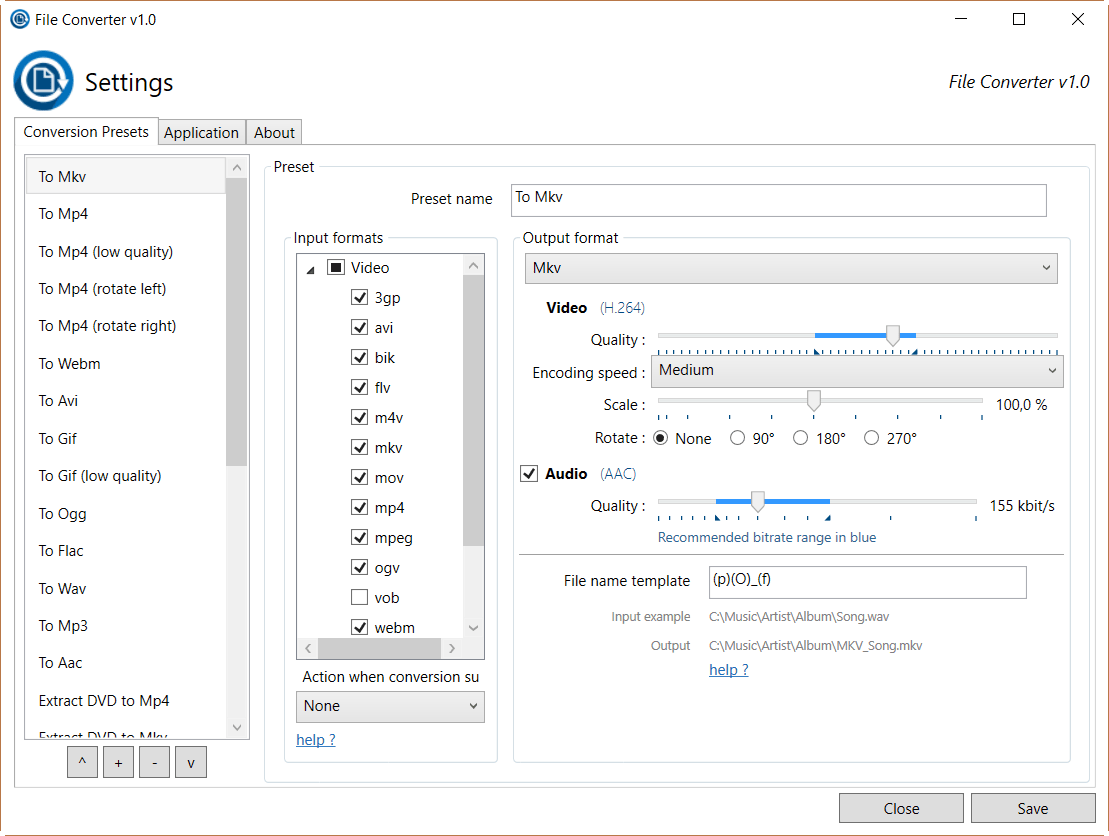 Met de File name template kun je de bestandsnaam van het uitvoerbestand instellen.