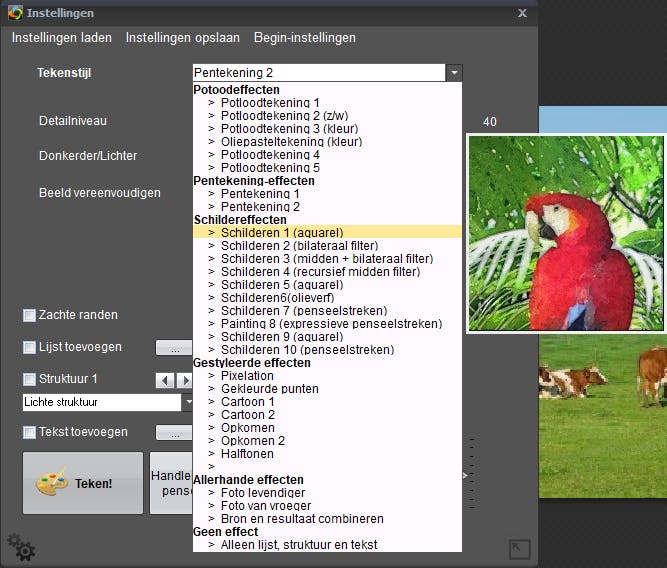 Er verschijnt een dialoogvenster waarin je de Tekenstijl selecteert, zoals Potloodtekening, Pentekening, Aquarel, Cartoon enzovoort (circa dertig modellen). Het resultaat kun je vervolgens met behulp van schuifknoppen en functies verder aanpassen. Een voorbeeldweergave toont meteen het effect.