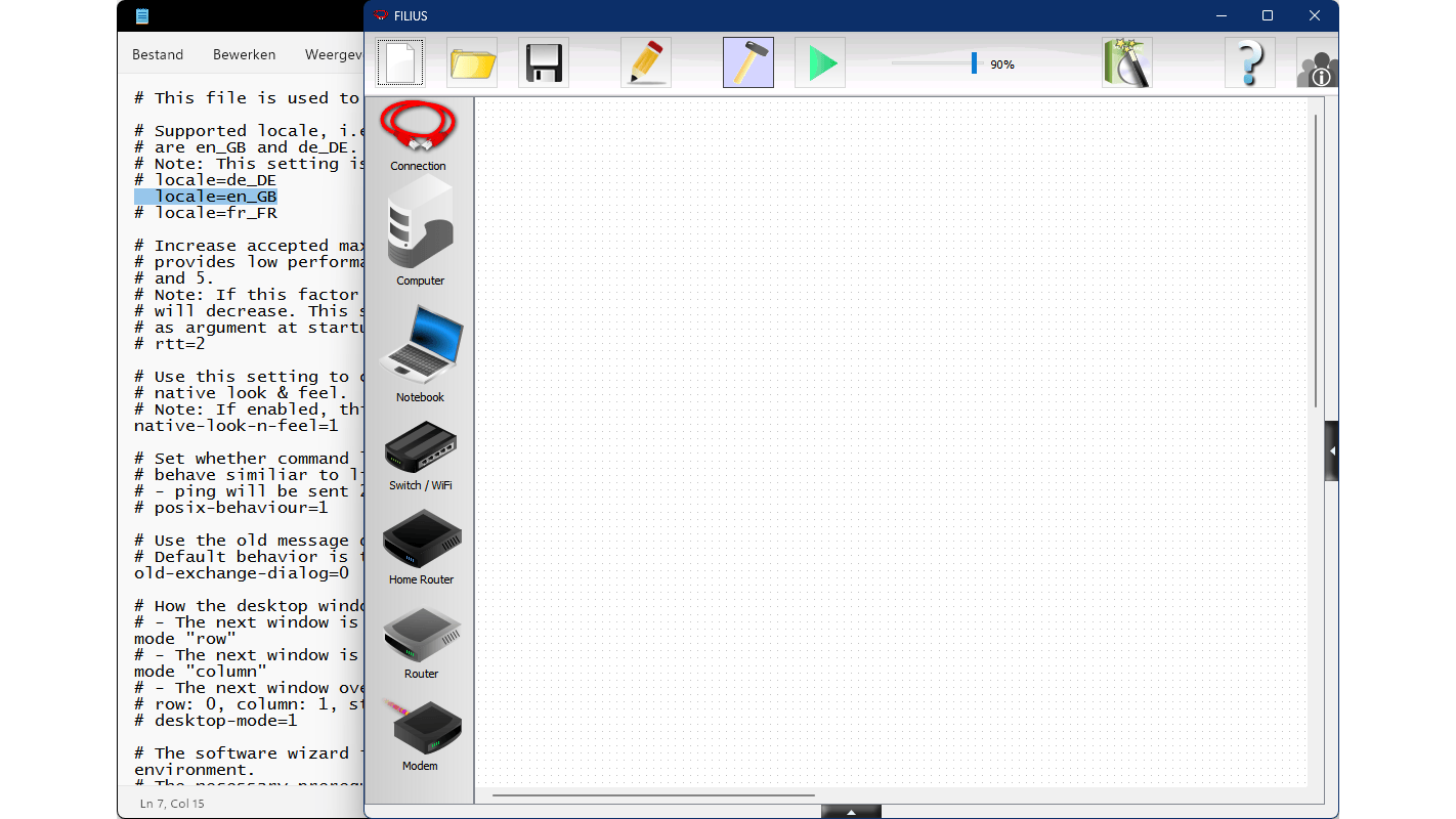 Als je per ongeluk de verkeerde taal hebt ingesteld, open dan het configuratiebestand filius.ini in de standaardmap \Program Files\Filius\config met Kladblok en verwijder het #-teken naast de gewenste taal, bijvoorbeeld # locale=en_GB. Er zijn hier trouwens nog andere instellingen die je kunt activeren door het #-teken te verwijderen.