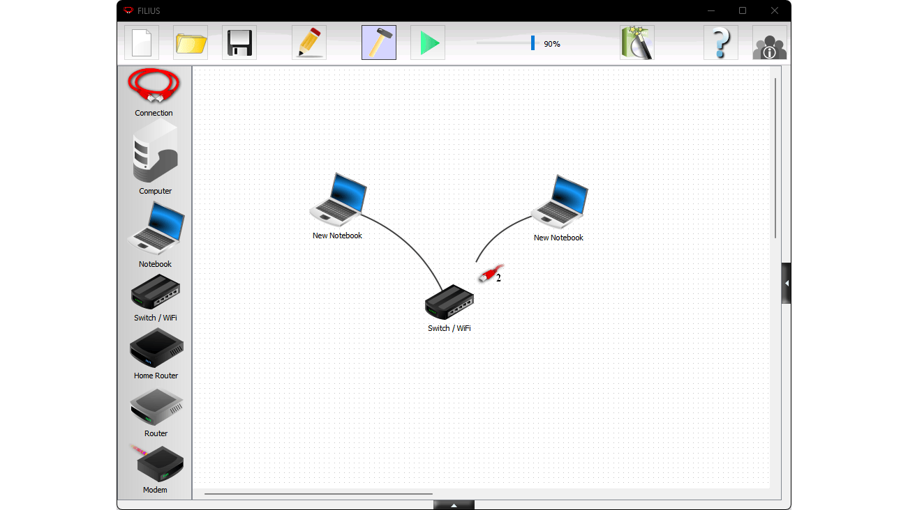 Het is raadzaam om vertrouwd te raken met de Filius-omgeving voordat je je netwerk gaat opbouwen. Er zijn namelijk drie modi waarin je kunt werken: de ontwerpmodus (hamericoon; om je netwerk op te zetten), de simulatiemodus (pijlicoon; om je netwerksimulatie te testen) en de documentatiemodus (potloodicoon; om tekst- en structuurvelden naar je netwerksimulatie te verslepen, hier doen we in dit artikel niets mee).