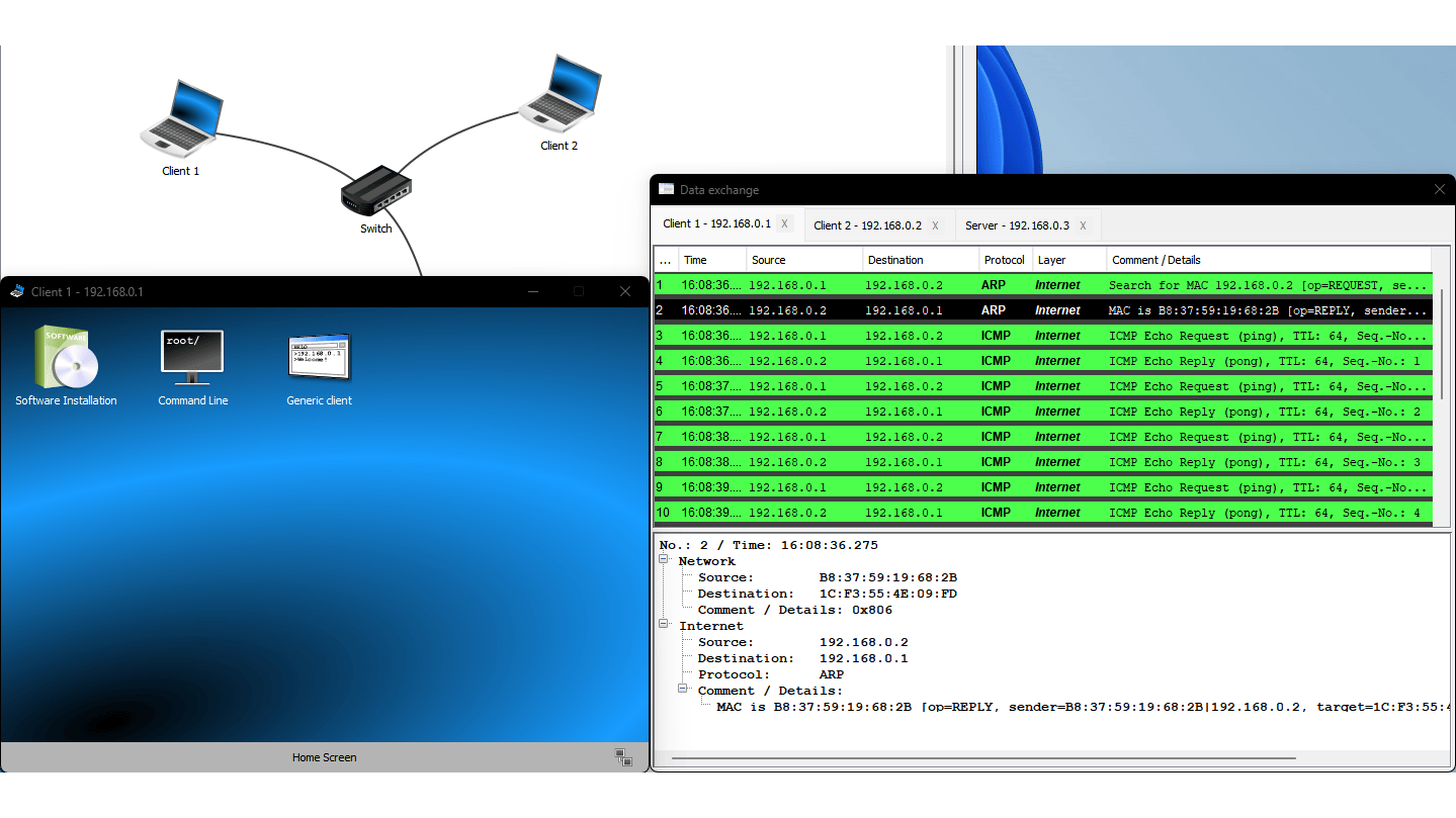 Dubbelklik nu op Command Line in het desktopvenster en voer ping 192.168.0.2 of ping 192.168.0.3 uit. Als alles goed is, ontvang je een reactie van beide doelcomputers. Je kunt dit netwerkverkeer trouwens ook op een andere manier bekijken. Klik met de rechtermuisknop op bijvoorbeeld Client 1 en kies Show data exchange. Je zult merken dat vooralsnog al het netwerkverkeer beperkt is tot de netwerk- of internetlaag (in het zogeheten OSI- en TCP/IP-model) en dat de eerste twee pakketten afkomstig zijn van het ARP-protocol (Address Resolution Protocol), om het fysieke MAC-adres van de doelcomputer te vinden. De overige datapakketten komen van het ICMP-protocol, dat standaard wordt gebruikt door ping. Klik op een datapakket voor meer details in het onderste deelvenster.
