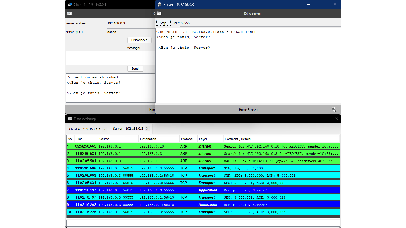 We laten deze pakketten van Client 1 komen. Dubbelklik hiervoor op de geïnstalleerde Generic Client en vul het ip-adres van je server in (192.168.0.3). Bevestig met Connect, typ een tekstbericht in bij Message en verstuur dit met Send. Als je nu het dataverkeervenster opent, zie je het bericht verschijnen en zie je dat voor zo’n netwerktoepassing ook de OSI-lagen Transport (via het TCP-protocol) en Application worden aangesproken.