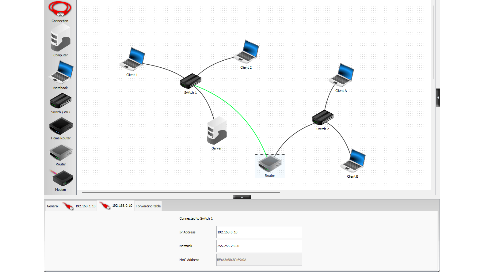 Verbind vervolgens elke computer met de switch: klik op Connection in het linkermenu en klik daarna op de twee apparaten die je wilt verbinden, bijvoorbeeld de computer en de switch. Druk op Esc als je hiermee klaar bent.