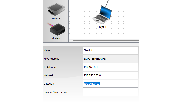 Laten we beginnen met het opzetten van een eenvoudig netwerk. Sleep een Switch, twee Notebooks en een Computer naar het ontwerpscherm. Plaats de switch bij voorkeur in het midden. Selecteer elk van deze vier componenten en geef ze vanuit het onderste deelvenster een passende naam, zoals Client 1, Client 2, Server en Switch. Geef de drie computers ook elk een ander ip-adres, bijvoorbeeld 192.168.0.1, 192.168.0.2 en 192.168.0.3, allemaal met hetzelfde subnetmasker 255.255.255.0. We kunnen hier helaas niet dieper ingaan op de betekenis en structuur van een subnetmasker, maar hier vind je meer informatie.