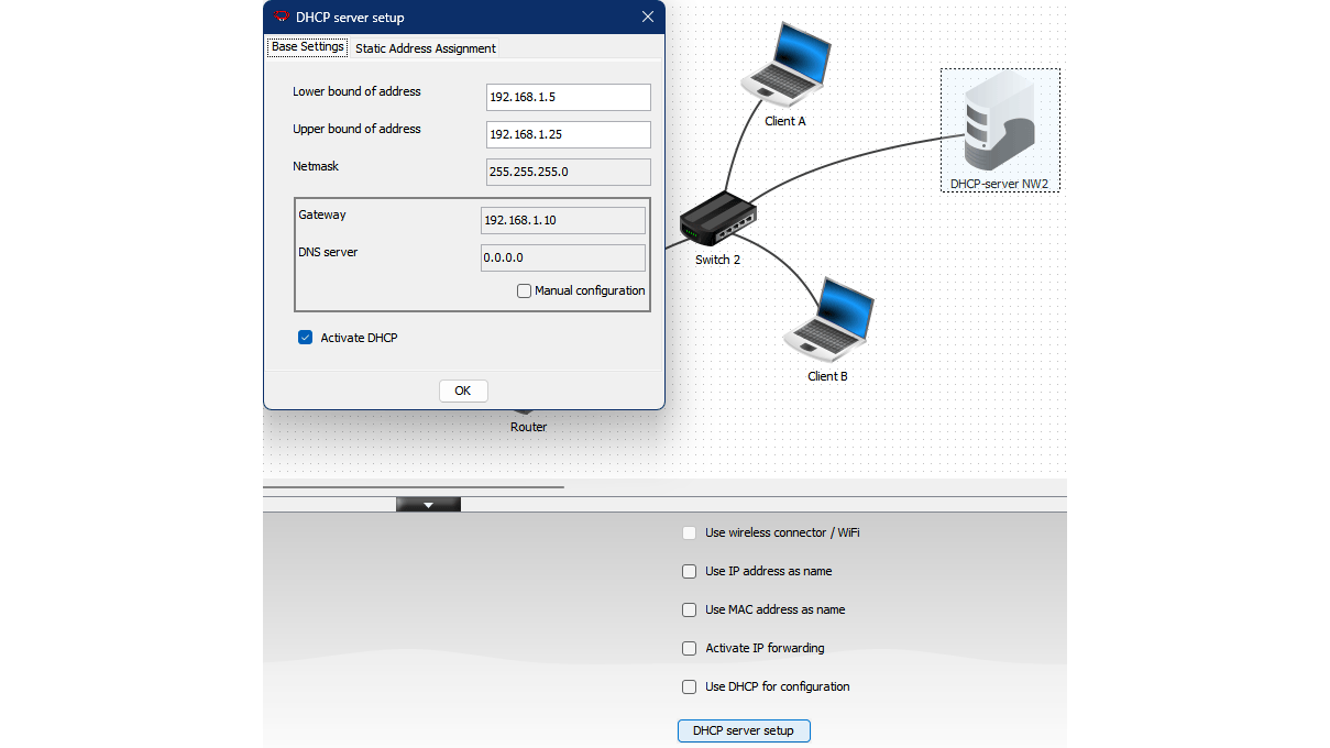Ga naar het eigenschappenvenster van zo’n server en klik rechtsonder op DHCP server setup. Geef het DHCP-adresbereik op, bijvoorbeeld van 192.168.0.1 achter Lower bound of address tot 192.168.0.20 achter Upper bound of address. Plaats een vinkje bij Activate DHCP en bevestig met OK.