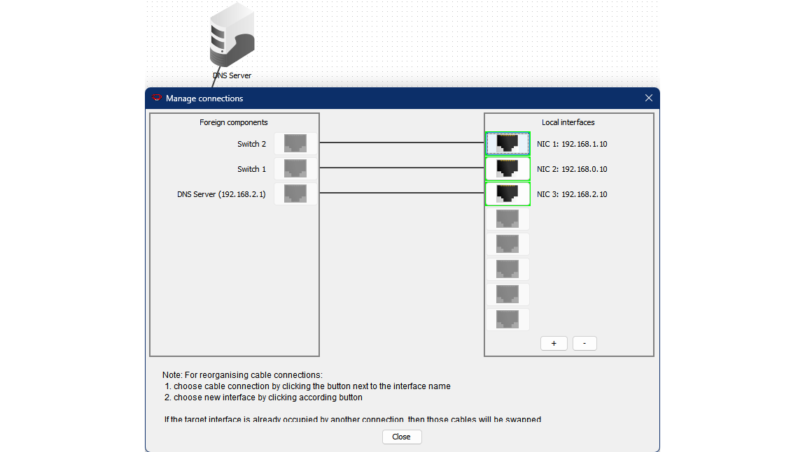 Hiervoor moet je een DNS-server (Domain Name System) opzetten. Voeg een server toe in een afzonderlijk subnet en geef deze bijvoorbeeld het ip-adres 192.168.2.1 met als Gateway 192.168.2.10. Maak deze gateway door in het eigenschappenvenster van je router naar het tabblad General te gaan en op Manage connections te klikken. Druk op de plusknop voor een extra verbinding en klik op Close. Open het toegevoegde tabblad en wijzig IP Address in 192.168.2.10. Verbind nu je DNS-server met de nieuwe verbinding op je router door een kabelverbinding te maken.