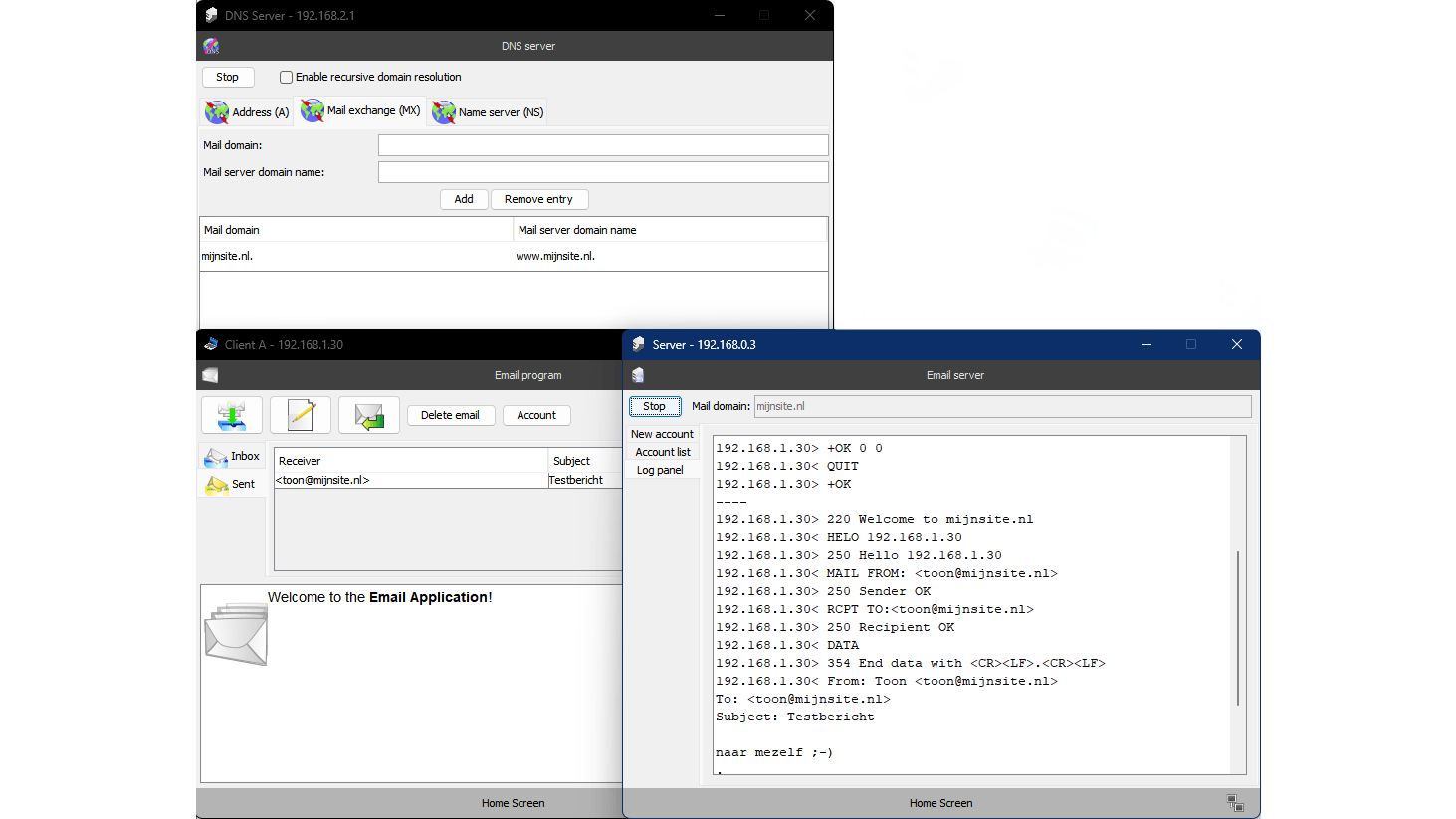 Selecteer vervolgens een willekeurige client en voeg het softwarepakket Email program toe. Open dit en klik op Account voor een nieuw e-mailaccount. Vul de gevraagde gegevens in. Als Email address kun je <naam>@mijnsite.nl gebruiken, bij POP3 server en bij SMTP server vul je www.mijnsite.nl in. De poorten laat je ongewijzigd. Vul bij User en Password dezelfde gegevens in als zojuist bij Email server. Bevestig met Save. Via de knop New email kun je nu een testbericht naar jezelf sturen. Uiteraard kun je nog andere e-mailaccounts maken en berichten naar elkaar versturen, op andere computers met Email program.