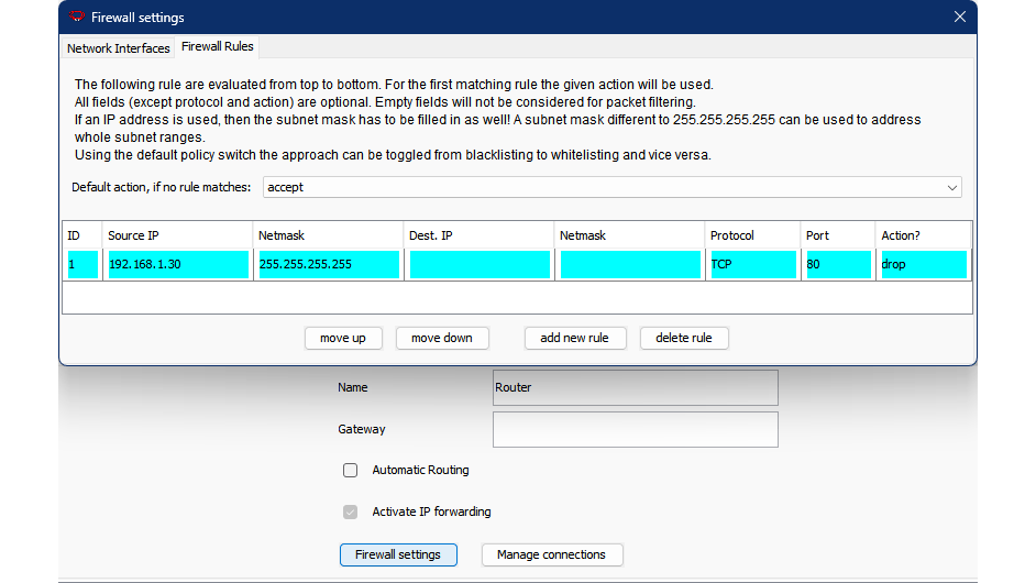 Ga naar het eigenschappenvenster van je router en open Firewall settings. Op het tabblad Network interfaces kun je Filter ICMP packets inschakelen, zodat ping-verzoeken niet meer doorkomen, maar wij zijn meer geïnteresseerd in het tabblad Firewall Rules. Een voorzichtige benadering is accept instellen als Default action if no rule matches. Hierdoor wordt alle verkeer dat niet door zelf gedefinieerde regels wordt onderschept, standaard toegelaten.