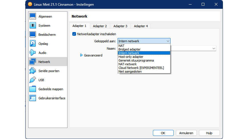 Naast een NAT-netwerk zijn er ook andere netwerkscenario’s mogelijk, zoals Intern netwerk, Bridged adapter en Host-only adapter.