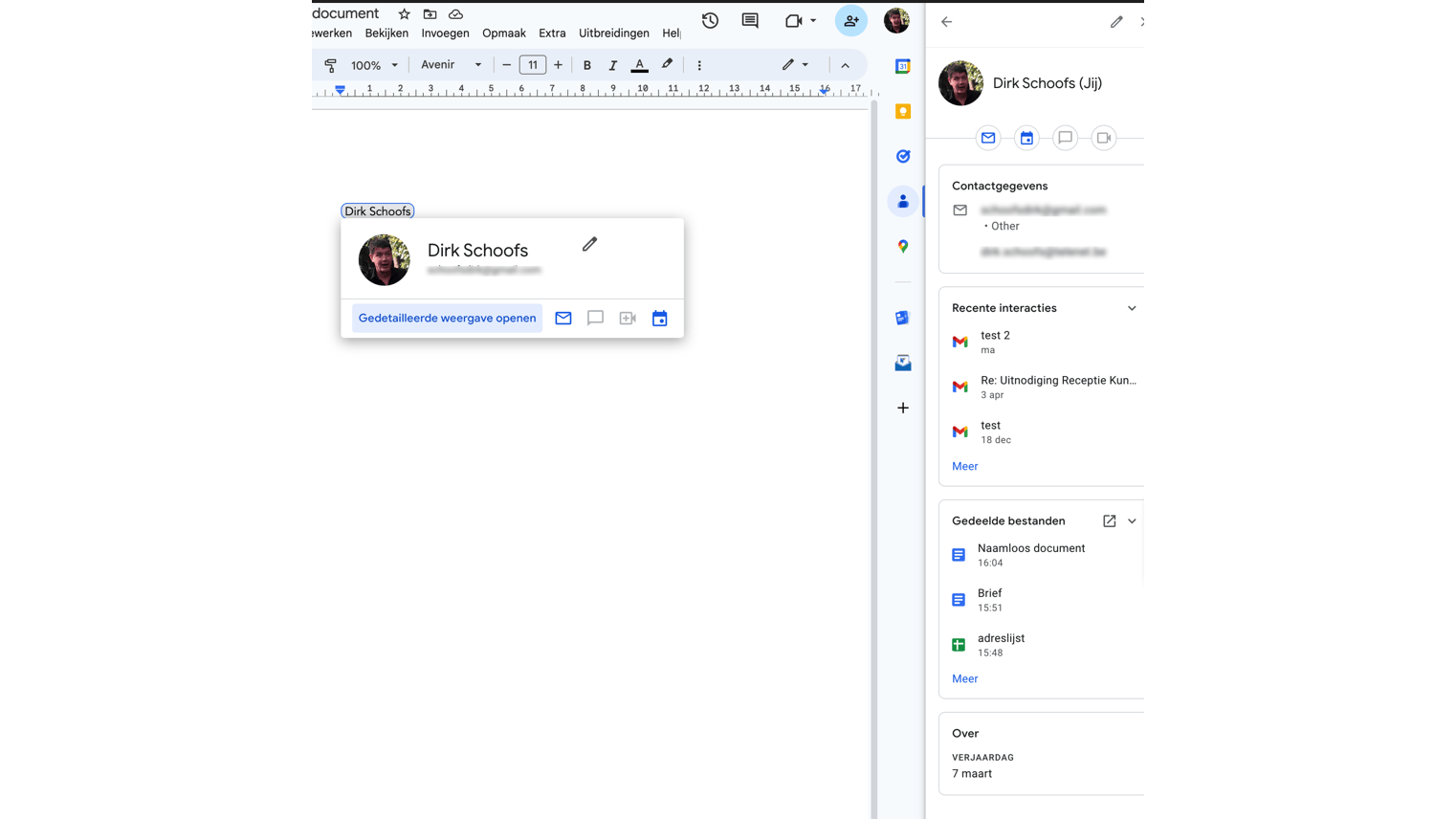 In de hoverbox zie je ook de knop Gedetailleerde weergave openen. Die gebruik je om de adresgegevens, de verjaardag en andere details van deze persoon in de zijbalk te lezen, op voorwaarde dat die gegevens in de info van Contacten staan.