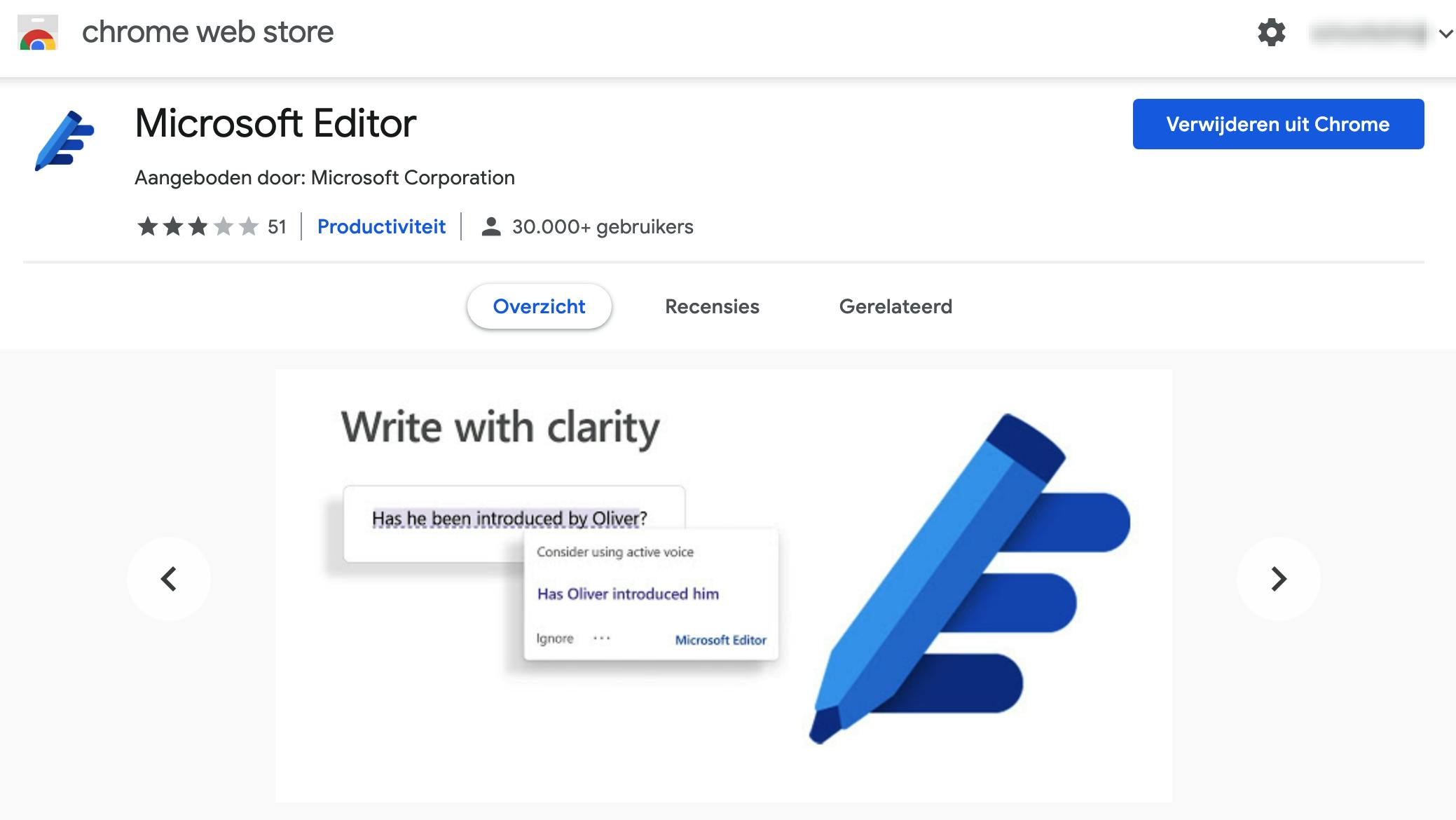 Je haalt de extensie voor de Google Chrome-browser hier op en voor Edge via deze website. Om verwarring uit te sluiten, Microsoft Editor is geen teksteditor, maar een toevoeging die een sterkere controle uitvoert van spelling, grammatica en interpunctie. Het is ook de bedoeling dat Editor in de online versie van Microsoft 365 wordt uitgerold. Na de installatie van de plug-in zie je rechts naast het adresvak de blauwe E-knop. Nadat je de add-on in je webbrowser hebt geïnstalleerd, moet je inloggen op je Microsoft-account om de tool in te schakelen.