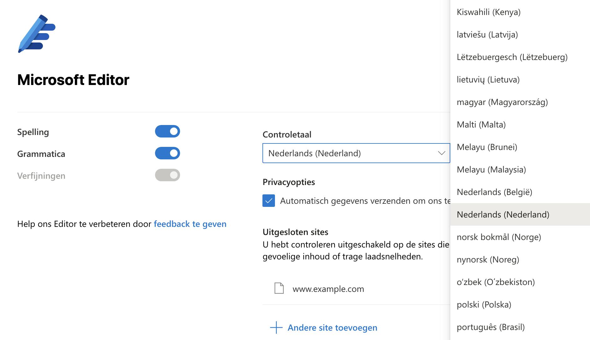 Microsoft Editor kun je instellen voor tientallen talen waaronder het Nederlands en verschillende taalvarianten. Het werkt zelfs voor talen die van rechts naar links zijn geschreven, zoals Japans. Is de tekst in meer dan één taal geschreven of wil je overschakelen naar een andere taal, dan selecteer je de tekst en vervolgens wijzig je via het werkbladpictogram de controletaal.