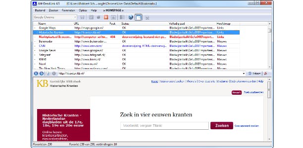 Na de browserkeuze toont het programma de lijst met favorieten. Met een druk op de knop Favorieten controleren, controleert het programma alle websites en laat het zien welke weblinks helemaal nergens meer op uitkomen, welke doorverwijzen (en of deze doorverwijzing correct is) en welke weblinks wel correct werken.