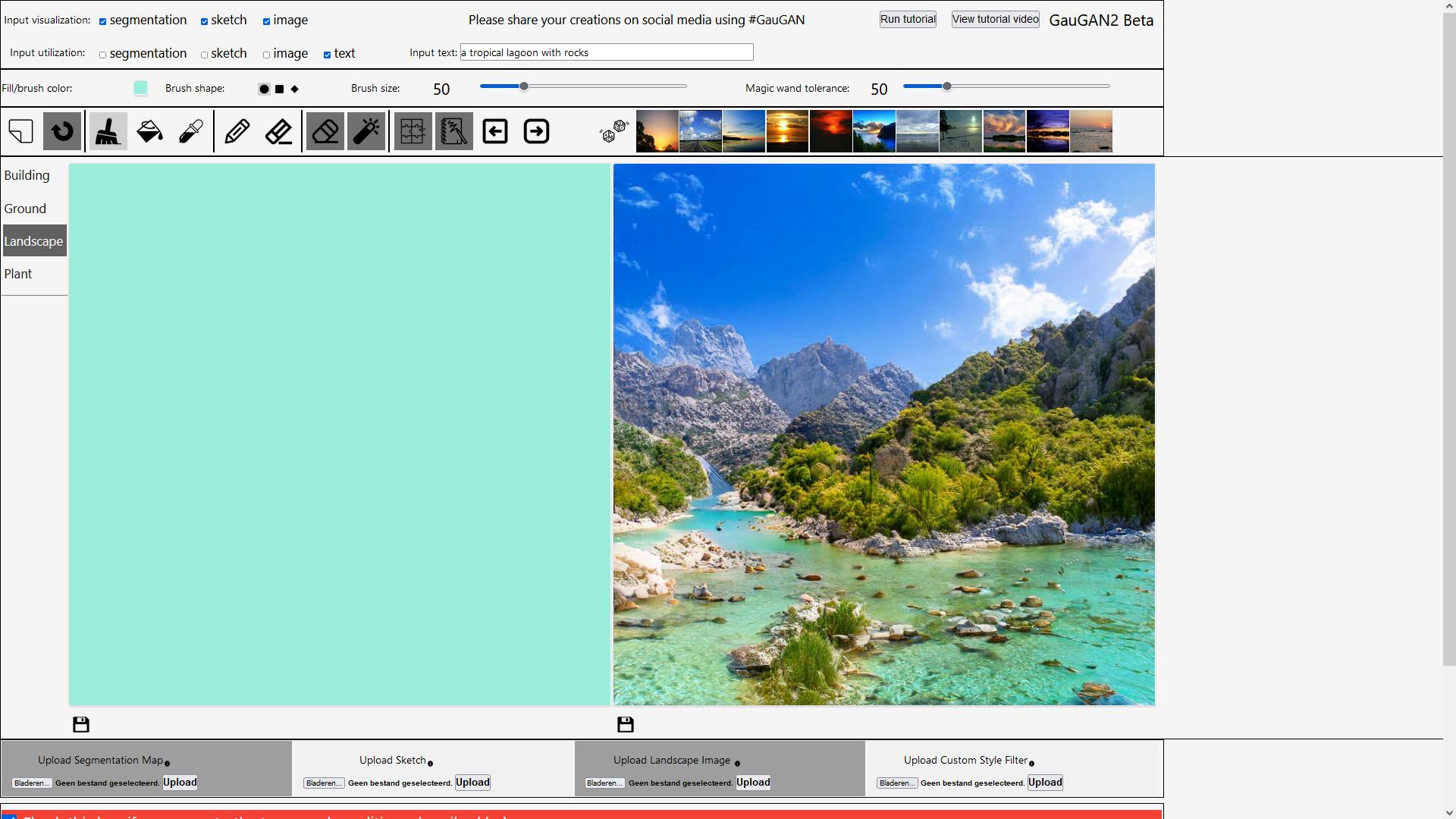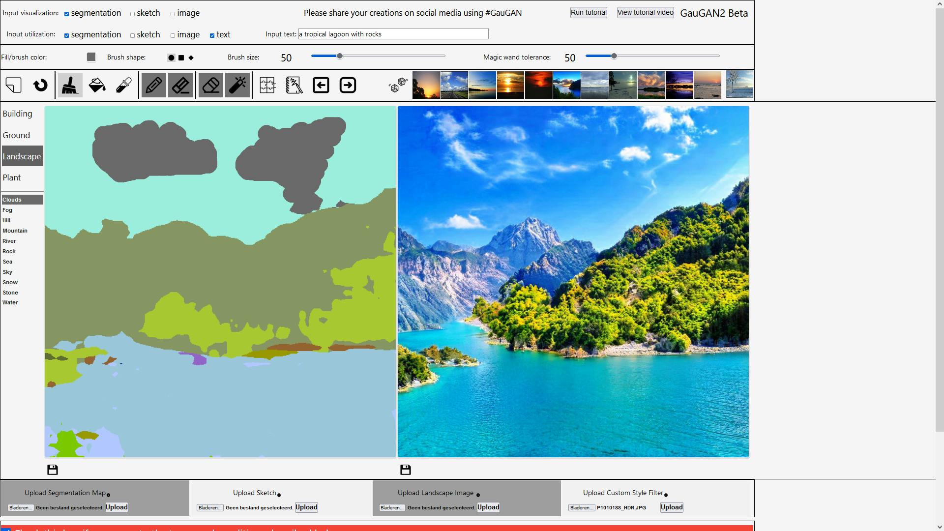 Met de derde mogelijkheid (image) kun je nieuwe landschappen genereren op basis van een bestaande foto of een eerder gegenereerd landschap. Met text, tot slot, kun je beeld maken aan de hand van slechts een omschrijving. Al deze mogelijkheden kun je bovendien combineren.