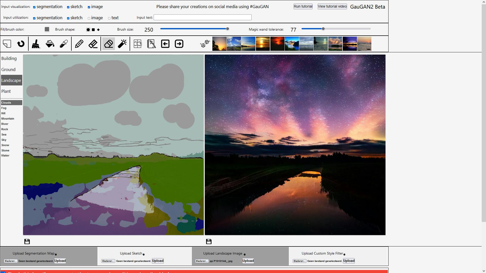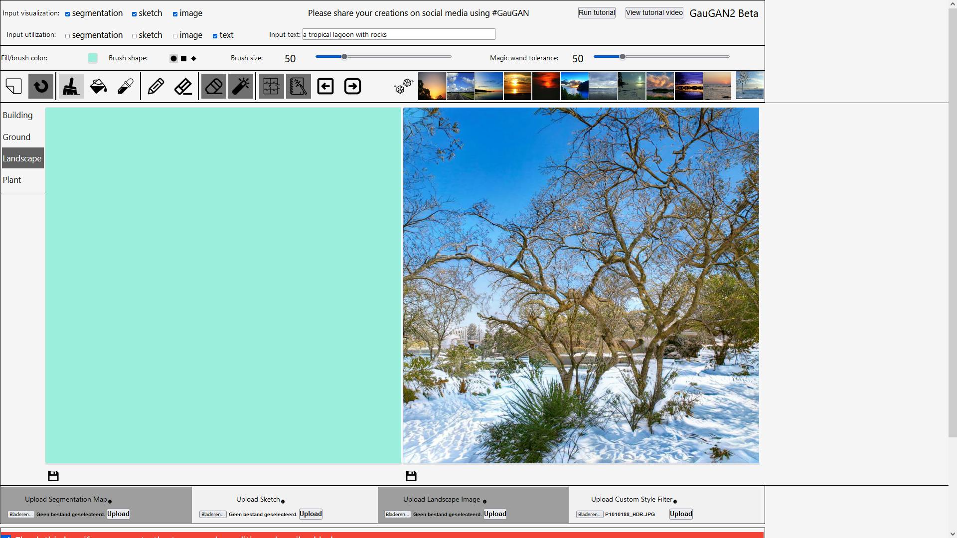 Zit er niets van je gading tussen, weet dan dat je niet beperkt bent tot de standaardstijlen. Je kunt ook zelf een foto uploaden om als richtlijn te gebruiken. Daarvoor klik je onder de foto bij Upload Landscape Image op Bladeren. Daarna selecteer je de gewenste afbeelding en klik je op Upload. Het plaatje verschijnt nu als laatste foto bij de beschikbare stijlen en als je erop klikt, probeert de AI er iets mee te doen.