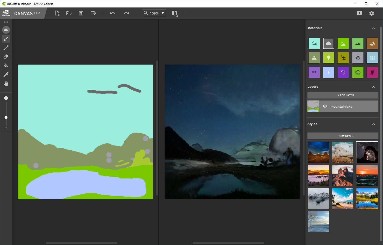 Beschik je over een grafische processor van Nvidia uit een van de RTX-series, dan kun je ook op je eigen pc landschappen in elkaar knutselen. Dat doe je met het gratis NVIDIA Canvas. Alhoewel het familie van GauGAN is, is Canvas niet exact hetzelfde. Zo kun je er wel eigen foto’s in gebruiken als stijl, maar kun je ze niet bewerken. Daarnaast is de verzameling bouwstenen in Canvas wat kleiner en kun je er bijvoorbeeld geen gebouwen mee maken. Tot slot ontbreekt ook de mogelijkheid om beeld te genereren op basis van tekst en heb je geen detailpenseel.