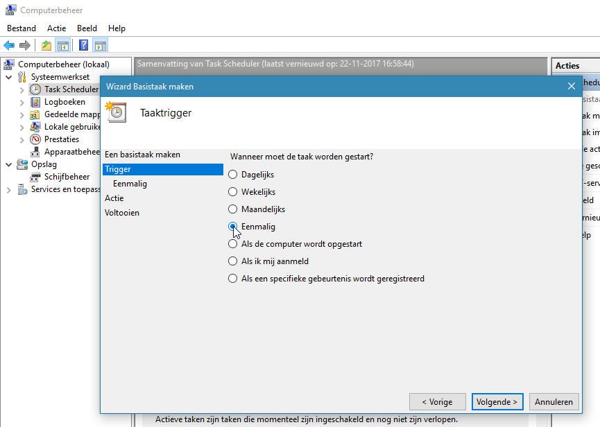Windows Taakplanner is eigenlijk een soort van schakelklok voor software. Je kan bijvoorbeeld Word of een browser op een vooraf gepland tijdstip laten starten. Desnoods met een interval als bijvoorbeeld dagelijks of wekelijks. Op die manier kan je jezelf er bijvoorbeeld toe aanzetten om een taak als het werken aan je verslag of rapport uit te voeren. Je vindt de Taakplanner door met de rechter muisknop op Start te klikken. Klik dan op Computerbeheer in het getoonde paneel. In het venster Computerbeheer klik je op Task Scheduler, te vinden onder Systeemwerkset in de kolom links. Klik in de kolom rechts op Basistaak maken. Geef de taak een naam, bijvoorbeeld Start Kladblok. Klik op Volgende en geef aan met welke frequentie of op welk moment de taak gestart moet worden. Bijvoorbeeld Dagelijks is een optie. Kies je voor Gebeurtenis, dan kan je een logboek-event gebruiken als trigger. Iets voor de echte liefhebbers dus. Of je kiest voor Als de computer wordt opgestart, zodat een programma of tool direct na elke systeemstart beschikbaar is. In dit voorbeeldje gaan we uit van een Eenmalig voorkomende gebeurtenis; selecteer deze optie dan ook en klik op Volgende.