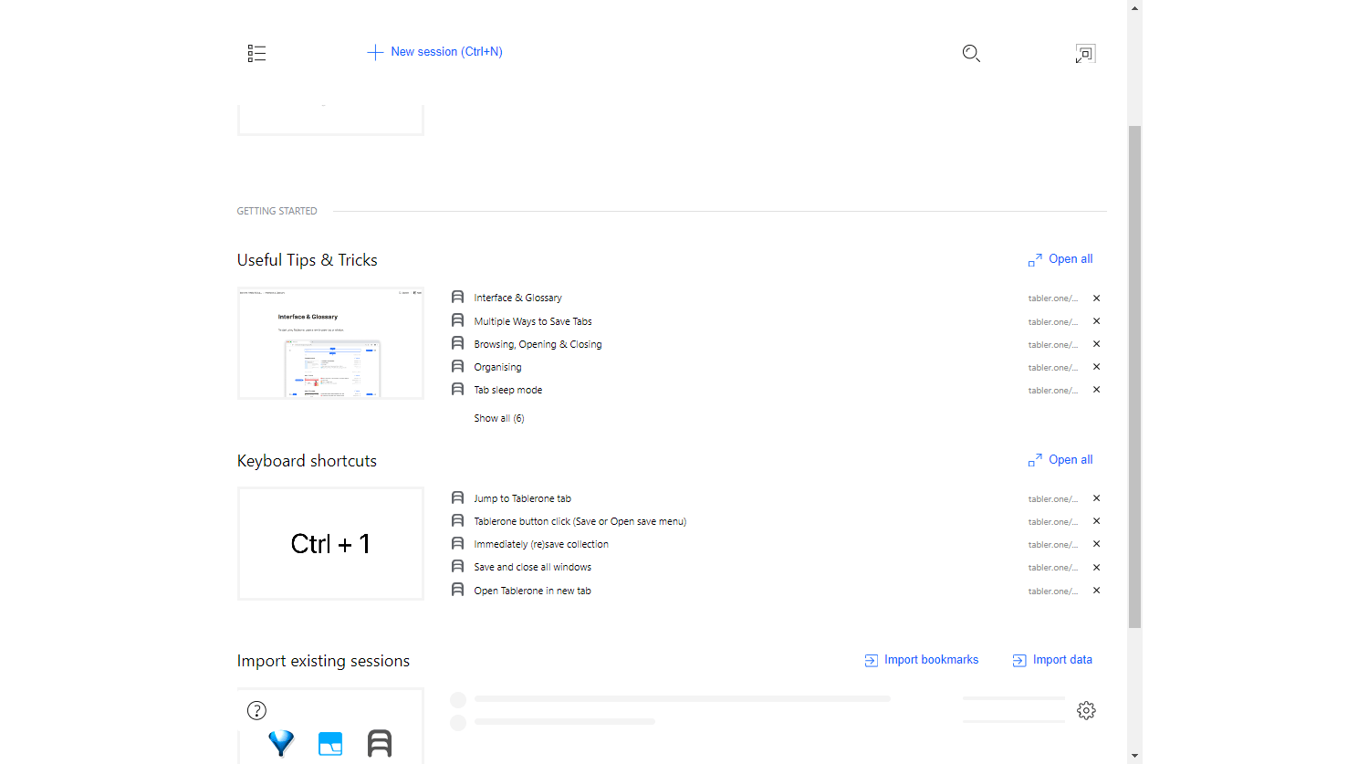 Door tabbladen op te slaan in een Chrome-pagina kun je ze snel sorteren. Het is zelfs mogelijk om de tabbladen thematisch te bundelen. Tablerone werkt met opgeslagen sessies in de tijdlijn en met werkruimten zodat je met één muisklik alle tabbladen opent waar je gisteren mee bezig was. Er is ook een knop om alle geopende sessies op te slaan.