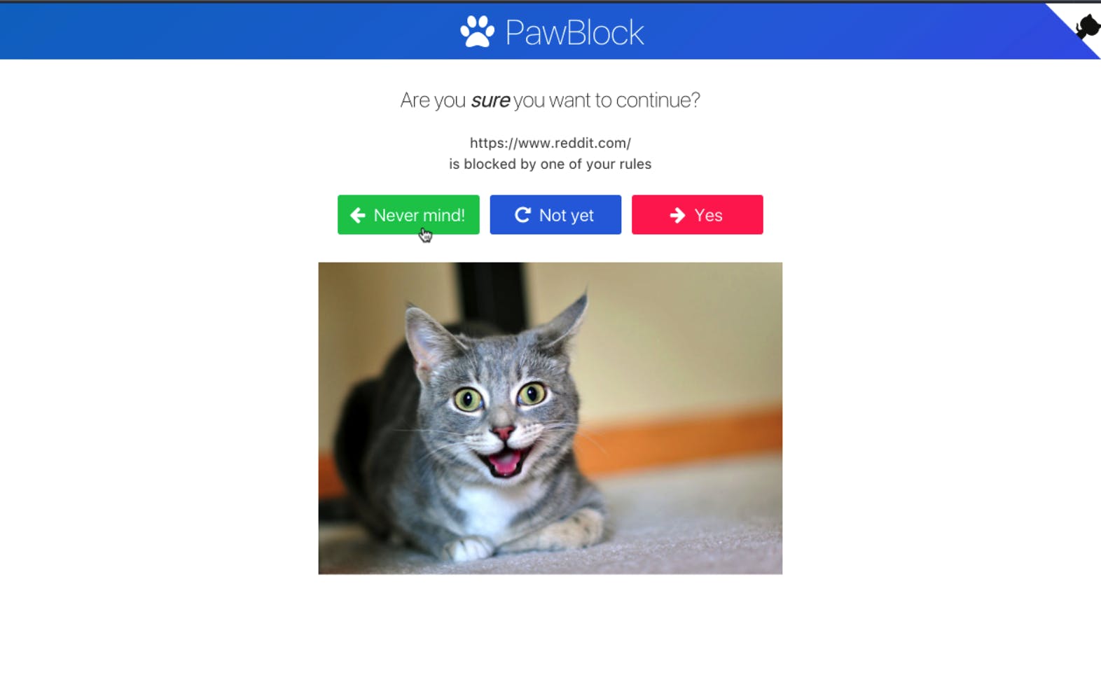 Je kent de websites waardoor je je veel te lang laat afleiden maar al te goed. PawBlock geeft je een duwtje in de rug om deze sites te vermijden. Als je toch naar een webadres gaat dat je eerder op de no-go-lijst hebt gezet, dan krijg je een schattige dierenfoto te zien die je aanmoedigt om bij de les te blijven. Het droevige snoetje ontmoedigt je om je te laten afleiden en het blije poezensnoetje zie je als je weer op het juiste spoor bent. Een luchtige manier om je productiviteit te verhogen. PawBlock werkt ook op Firefox.